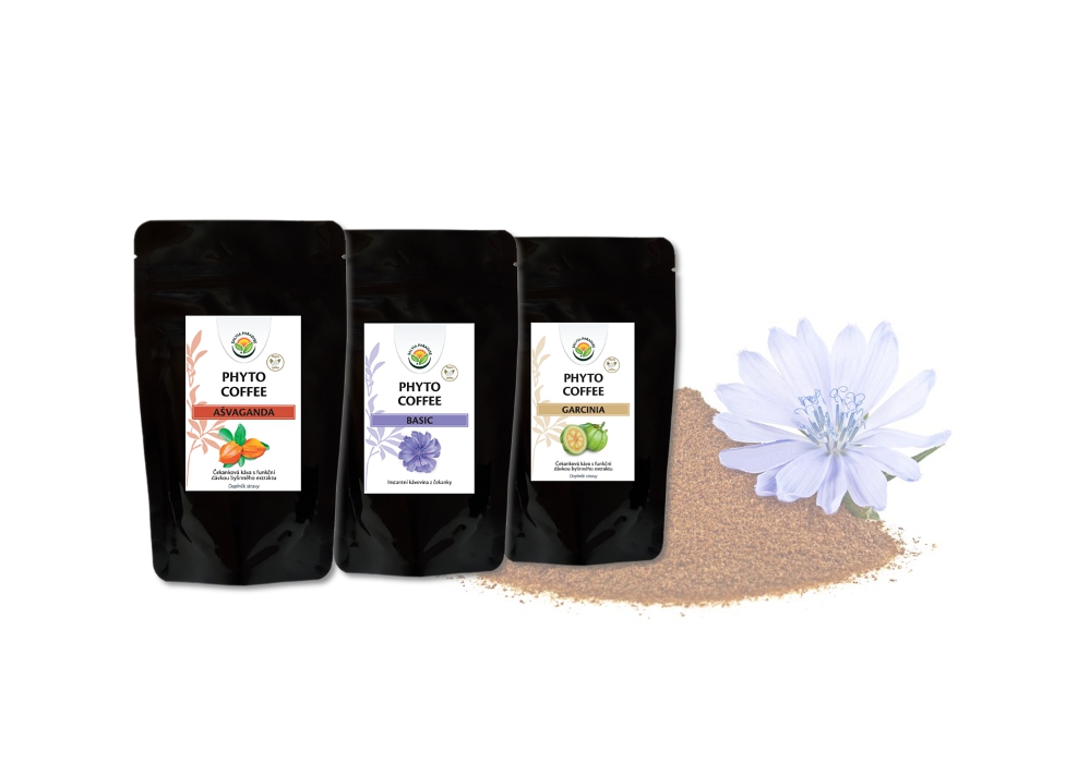 Kozlík, echinacea, vilcacora, šatavari a chanca piedra Phyto Coffee – unikátní spojení čekankové kávy a bylinných standardizovaných…